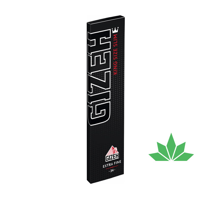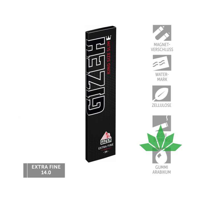 GIZEH BLACK® King Size Slim sind extra feine, fast transparente Blättchen mit einem Flächengewicht von 14 g/m² und einer Gummierung aus natürlichem Gummiarabikum, dem Saft des Akazienbaums. Das extra feine Papier sorgt für puren und unverfälschten Genuss. Die Blättchen haben das King Size Slim Format, brennen sehr langsam ab und gehen aus, wenn nicht an der Selbstgedrehten gezogen wird. Je 34 Blättchen sind in einer Packung mit Magnetverschluss.
