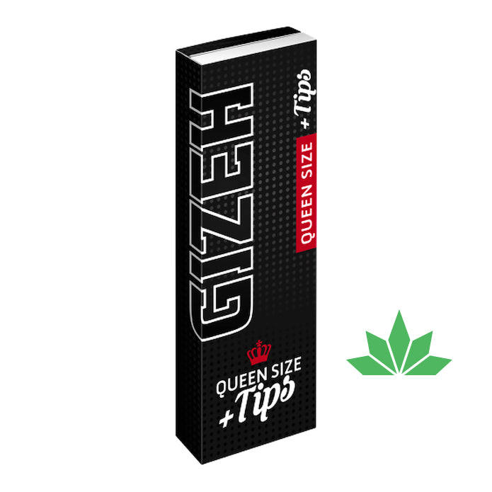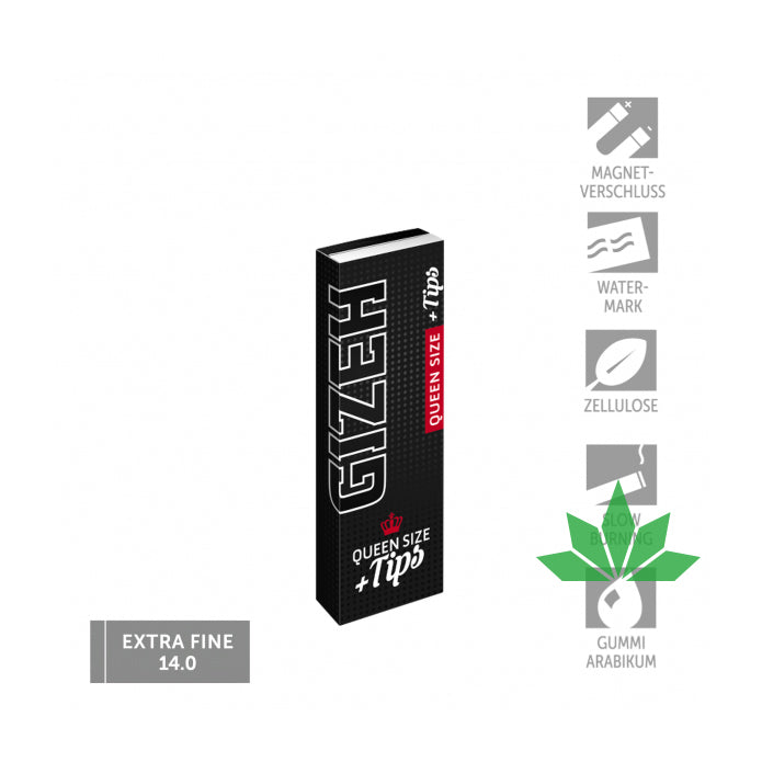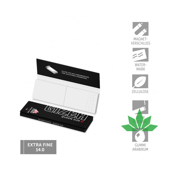 GIZEH BLACK® Queen Size + Tips – die kleine Alternative zu unserem GIZEH BLACK® King Size Slim. Das Heftchen mit dem GIZEH-typischem Magnetverschluss enthält 50 extrafeine Blättchen im Queen Size-Format von 78 mm x 44 mm (1 ¼ Size) und 50 Filter-Tips. Mit diesem praktischen Kombipack hast du alle Utensilien für den entspannten Genuss direkt zur Hand. Zum leichteren Drehen sind die Filter-Tips perforiert. Die extrafeinen, fast transparenten Blättchen haben ein Flächengewicht von 14 g/m² und eine Gummierung aus natürlichem Gummiarabikum, dem Saft des Akazienbaums. Das extrafeine Papier sorgt für puren und unverfälschten Genuss. Die Blättchen brennen sehr langsam ab und gehen aus, wenn nicht gezogen wird.
