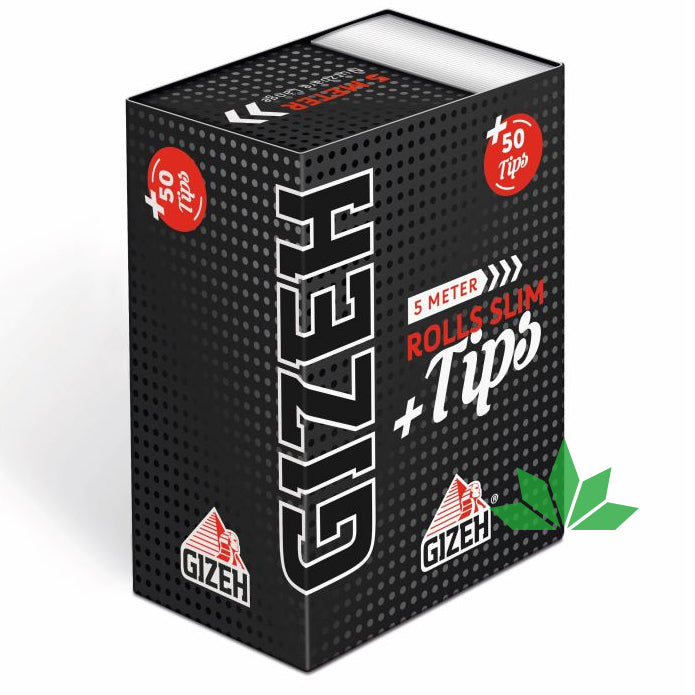 Mit GIZEH BLACK® Rolls Slim + Tips erhältst du neben 50 vorperforierter Filter Tips auch 5 Meter unserer hauchdünnen Blättchen im Slim Format. Somit entscheidest du allein über die individuelle Länge deines King Size Moments -, Papier und Filter Tips sind im kompakten Format stets zur Hand.