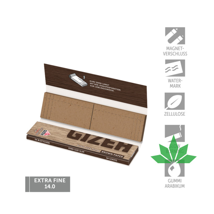 Unser King Size-Büchel mit dem GIZEH-typischen Magnetverschluss enthält 34 extrafeine, ungebleichte und ungefärbte King Size Slim-Blättchen und 34 vorperforierte Filter Tips. Damit wird das Drehen noch angenehmer und du hast deine Papier- und Filter-Tips immer zur Hand. Die Filter-Tips sind doppelt perforiert zur Verwendung im Regular- oder Slim-Format. Die extrafeinen braunen Blättchen haben ein Flächengewicht von 14 g/m² und besitzen eine Gummierung aus natürlichem Gummiarabikum, dem Saft des Akazienbaums. Das extrafeine Papier sorgt für puren und unverfälschten Genuss. Die Blättchen brennen sehr langsam ab und gehen aus, wenn nicht gezogen wird.