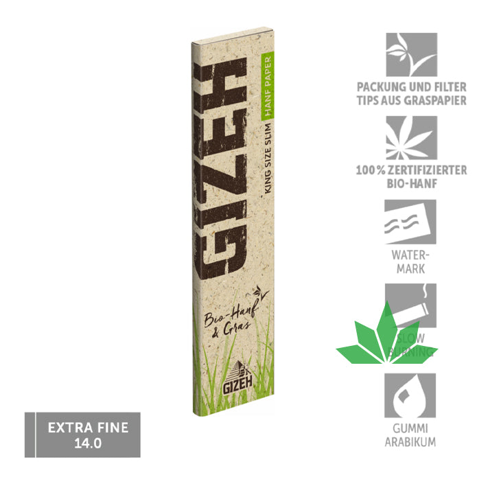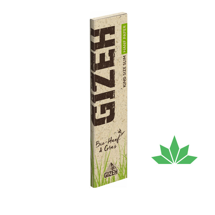 GIZEH Hanf & Gras King Size Slim sind ungebleichte und ungefärbte Blättchen, die aus 100% zertifiziertem, biologisch angebautem Hanf hergestellt werden. Die extra feine Beschaffenheit der Blättchen sorgt dabei für einen unverfälschten Genussmoment, der durch das langsamere Abbrennen unterstützt und verlängert wird. Die Papers kommen in gewohnter GIZEH Qualität mit 34 Blättchen, sowie einer nachhaltigen Verschlussmechanik ohne Magneten.
