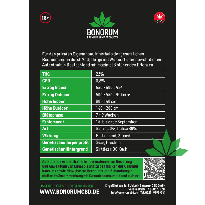 Skittlez Samen ist eine ertragreiche Sorte, die schon früh in der Wachstumsphase ein intensives Aroma aus Beeren und Trauben entwickelt. Die zentrale Cola und mehrere kleine Nuggets sorgen für einen imposanten Ertrag von 500-700g/m² oder 400-600g pro Pflanze. Die Blüte dauert nur 7-9 Wochen und ist im September ideal zu ernten.