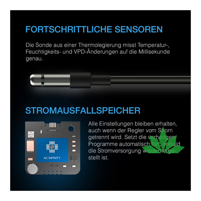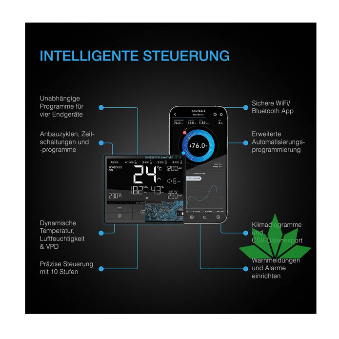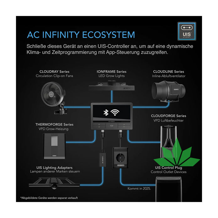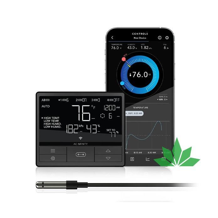 Ein Controller der nächsten Generation, der AC Infinity-Geräte mit einer intelligenten Programmierung ausstattet, um optimale Klimabedingungen zu schaffen. Diese zentrale Steuereinheit kann mit bis zu vier verschiedenen Geräten verbunden werden, von Ventilatoren bis hin zu Grow Lights, und bietet jedem Gerät eine unabhängige Klima- und Zeitprogrammierung. Das hintergrundbeleuchtete Display zeigt die Temperatur in Fahrenheit oder Celsius an und kann ausgeschaltet werden, während die Programme im Hintergrund laufen. Er ist mit einem Standfuß ausgestattet und kann mit den mitgelieferten Halterungen an der Wand befestigt werden. Der Messfühler mit Thermolegierungskopf misst die aktuelle Temperatur und Luftfeuchtigkeit genau. Sie erfasst auch das Dampfdruckdefizit (VPD), das die Umgebungstemperatur, die relative Luftfeuchtigkeit und die Blatttemperatur der Pflanze misst, um die optimale Atmosphäre zu bestimmen. So kannst du die Wachstumsbedingungen genauer überwachen, als wenn du dich nur auf Temperatur und Luftfeuchtigkeit verlassen würdest. Dieses Produkt ist Teil der UIS™-Plattform von Anbaugeräten und intelligenten Controllern, die so konzipiert sind, dass sie miteinander integriert werden können, um deine ideale Umgebung zu erreichen.