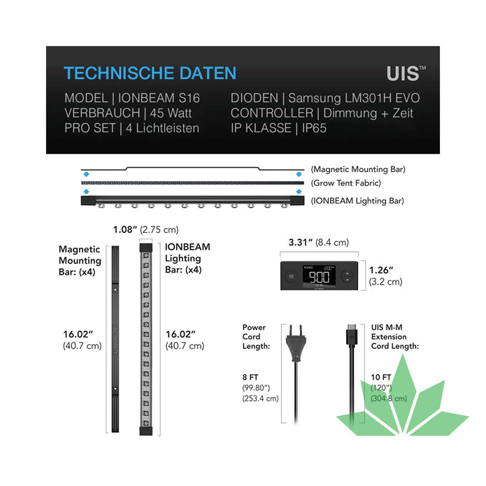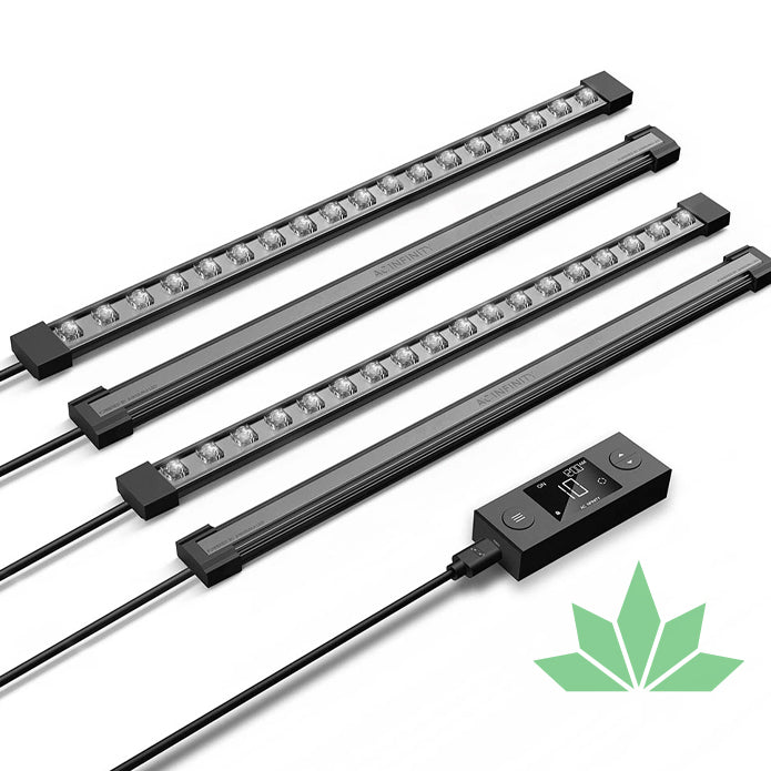 Mehrzweck-LED-Leiste, konzipiert für den Einsatz als Zwischenraum-, Zusatz- oder primäres Grow Light. Bei optimaler Positionierung wird dieses Kit das Wachstum und die Erträge deiner Pflanzen maximieren. Jede LED-Leiste ist IP65-zertifiziert und gegen Wasser- und Staubeintritt geschützt. Das einteilige Gehäuse und die Aluminiumplatine beherbergen nicht nur eine Reihe von Vollspektrum Samsung LM301H EVO weißen LEDs, sondern führt auch gleichzeitig Wärme ab, was sich positiv auf die Lebensdauer der Dioden auswirkt. Das Kit umfasst einen Beleuchtungscontroller, vier LED-Leisten und vier Stahlstangen, die eine flexible Montage in deinem Growzelt ermöglichen.  Dieses Produkt ist Teil der UIS™-Plattform von Wachstumsgeräten und intelligenten Controllern, entworfen, um miteinander zu interagieren und so Ihr ideales Umfeld zu erreichen.