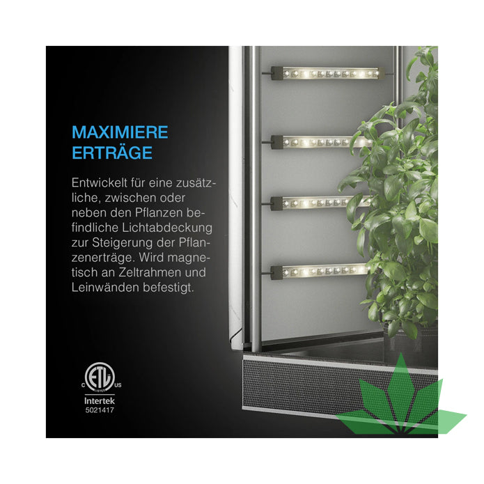 Magnetische Befestigung an Gestellen und Wänden von Growzelten mit den mitgelieferten Stahlstangen. Bietet erweiterte Abdeckung für Zwischenraumbereiche, die von deinem primären LED Grow Light schwer erreicht werden. Jede LED-Leiste ist mit Horticulture Series Samsung LM301H EVO 3000K und 5000K weißen Dioden ausgestattet, speziell entwickelt für ein optimiertes Pflanzenwachstum. Sie können weitere LED Leisten miteinander verbinden, um die Ausleuchtung noch weiter zu optimieren.