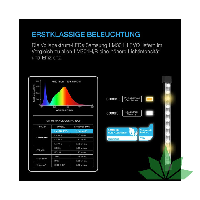• Verwendet Vollspektrum Samsung LM301H EVO LED, für eine leistungsstarke Beleuchtung, welche für alle Pflanzenwachstumsstadien optimiert wurde.