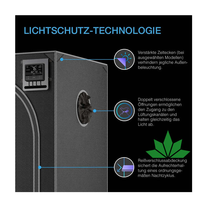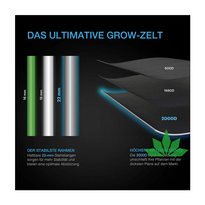 Dieses Zelt wurde für die Aufzucht von Pflanzen in Innenräumen entwickelt und bietet vollständige Kontrolle über die Klimabedingungen. Das Zelt ist mit einem Schnellsichtfenster ausgestattet und besteht aus wasserdichtem Oxford-Gewebe mit einer Stärke von 2000D, das besonders langlebig und lichtundurchlässig ist. Die Innenwände sind mit kreuzförmig gemustertem Mylar überzogen, das die Lichtleistung deines Grow-Lichts reflektiert und maximiert. Eine innere Bandnaht versiegelt den Reißverschluss im Inneren des Zelts, um maximale Reflektivität zu gewährleisten und Lichtverluste zu verhindern. Dazu kommt eine Schutzabdeckung, die sich über die gesamte Länge des vorderen Reißverschlusses erstreckt und einen weiteren Schutz gegen eindringendes Licht bietet. Die Lüftungsöffnungen können auf beiden Seiten geschlossen werden, um die lichtdichte Abdichtung zu gewährleisten. Zum Zubehör gehören eine wasserdichte Bodenwanne, eine abnehmbare Werkzeugtasche, zusätzliche Aufhängestangen für das Dach und eine Montageplatte, mit der du deinen Controller am Growzelt befestigen kannst.