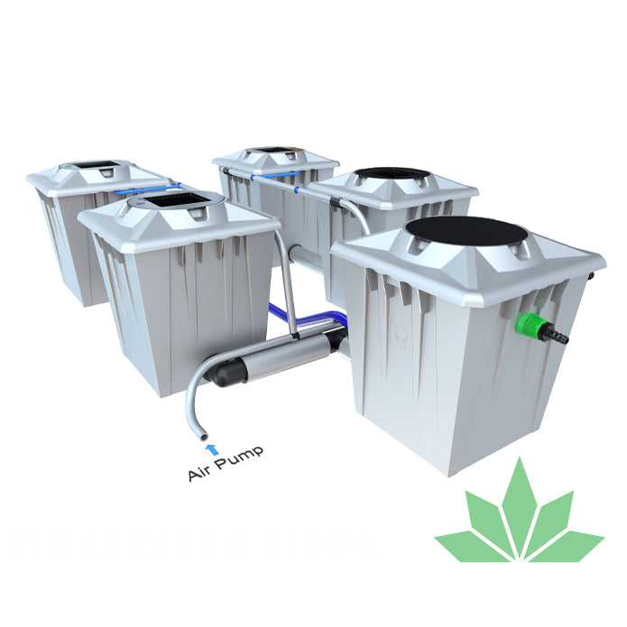 Im RDWC-System wurzeln Deine Pflanzen direkt in der zirkulierenden Nährlösung. Ein kontinuierlicher Luftstrom versorgt das Wurzelwerk mit Sauerstoff – damit beugst Du nicht nur Fäulnis effektiv vor, sondern gibst Deinen Pflanzen alles, was sie für schnelles und gesundes Wachstum brauchen.