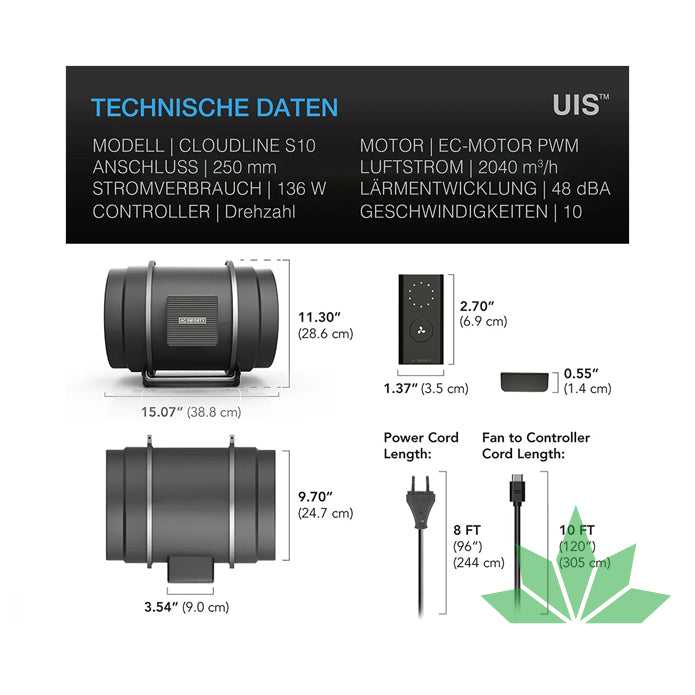 CLOUDLINE PRO S10, leises Inline-Lüftersystem mit Drehzahlregler, 250 mm
