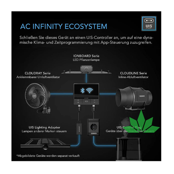 Der CONTROLLER 69 PRO verfügt über eine intelligente Programmierung, die nicht nur grundlegende Temperatur-, Luftfeuchtigkeits- und VPD-Trigger enthält, sondern es dir auch ermöglicht, dynamische Lüftergeschwindigkeiten einzustellen, die auf deren Veränderungen reagieren. Du kannst sogar noch weiter gehen, indem du eine Mindestgeschwindigkeit festlegst, bei der der Ventilator konstant läuft und nur bei Auslösung erhöht wird. Timer-, Zyklus- und Zeitplan-Modi ermöglichen eine individuelle Aktivierung bei Bedarf für verschiedene Zwecke. Verbinde dich sicher über WiFi mit der AC Infinity App, um die Automatisierungsfunktionen von überall aus zu nutzen. Du kannst aus der Ferne auf deinen Ventilator zugreifen, Programme freischalten, Benachrichtigungen einstellen, historische Klimadiagramme ansehen und CSV-Daten exportieren. Dieser Controller kann mit bis zu vier UIS-Geräten verbunden werden, darunter Produkte wie die CLOUDLINE-, CLOUDRAY- und IONFRAME-Serie. Mit ausgewählten Adaptern kann er auch mit deinem bevorzugten Grow Light und Steckdosengerät außerhalb der UIS-Plattform verbunden werden.