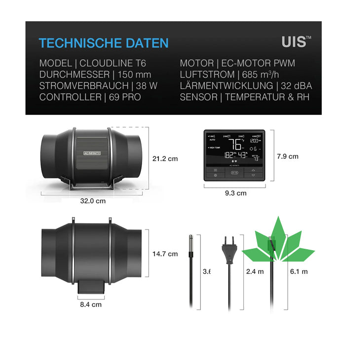 CLOUDLINE PRO T6, leises Inline-Lüftersystem mit Temperatur- und Feuchtigkeitssteuerung, 150 mm