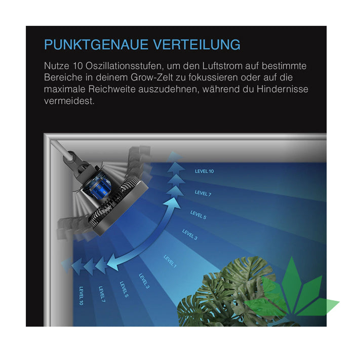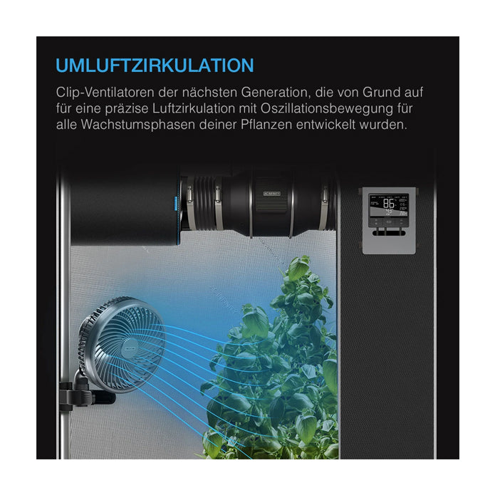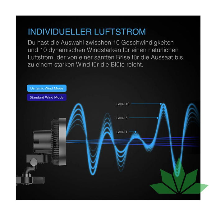 Mit den 10 Geschwindigkeitsstufen, den 10 dynamischen Windmodi und den 10 Oszillationseinstellungen dieses Clip-Fan für das Growzelt kannst du den Luftstrom ganz individuell steuern. Passe jede Entwicklungsphase individuell an, um ein ganz persönliches Wachstumserlebnis zu schaffen. Mit unserer großen Auswahl an dynamischen Modi kannst du die maximale Stärke des variierenden Windstroms bestimmen und so ein gesünderes Wachstum mit weniger Stress für deine Pflanzen sicherstellen. Der Oszillationsbereich bietet eine vollständige Zeltabdeckung und kann Hindernisse vermeiden. So kannst du die Luftzirkulation für jedes Wachstumsstadium deiner Pflanzen präzise einstellen, von einer sanften Brise für Keimlinge und Setzlinge bis hin zu einem starken Luftstrom für die Vegetations- und Blütezeit.