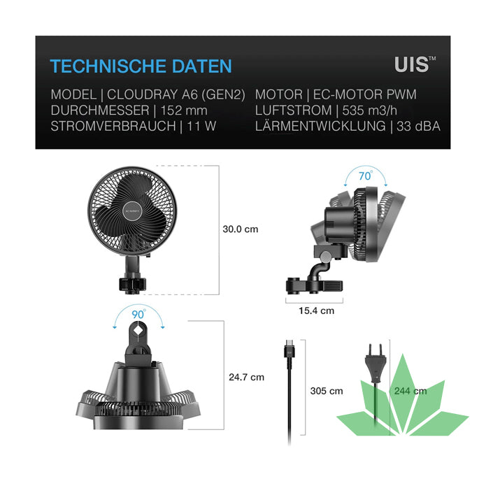 Ein hochinnovativer Clip-Ventilator, der komplett neu entwickelt wurde, um eine gezielte Luftzirkulation zu gewährleisten und jede Phase des Wachstumszyklus deiner Pflanzen zu optimieren. Mit zehn digitalen Geschwindigkeitsstufen und zehn dynamischen Windmodi kannst du den Luftstrom individuell anpassen, um die Umgebung im Freien zu simulieren. Für eine noch bessere Kontrolle kannst du die zehn Oszillationsstufen nutzen, die eine gezielte Luftzirkulation an bestimmten Stellen oder eine möglichst große Reichweite bieten. Dieser Clip-Ventilator ist IP44-zertifiziert, damit er auch bei hoher Luftfeuchtigkeit und hohen Temperaturen im Dauereinsatz seine Spitzenleistung beibehält. Außerdem erfüllt er die ETL-Normen (Zertifikat Nr. 5027708) für die Sicherheit von Elektrogeräten und gewährleistet so einen sicheren Einsatz. Dieses Produkt ist Teil der UIS™-Plattform von Anbaugeräten und intelligenten Steuerungen, die mit der AC Infinity App über WiFi verbunden werden können, um deine ideale Umgebung zu schaffen.