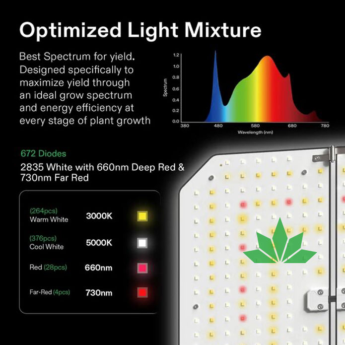 - Lampe: 2 x AeroLight Wing AW200SE, 200W Vollspektrum-LED-Pflanzenlampe (Optimale Ausleuchtung für 120x120 cm Anzuchtzelt), justierbare Flügel um Einstrahlungswinkel zu erweitern, Samsung 301B LED Chips, Farbspektrum 380-780 nm,660 nm, 3000K, 5000K) mit integriertem Umluftventilator