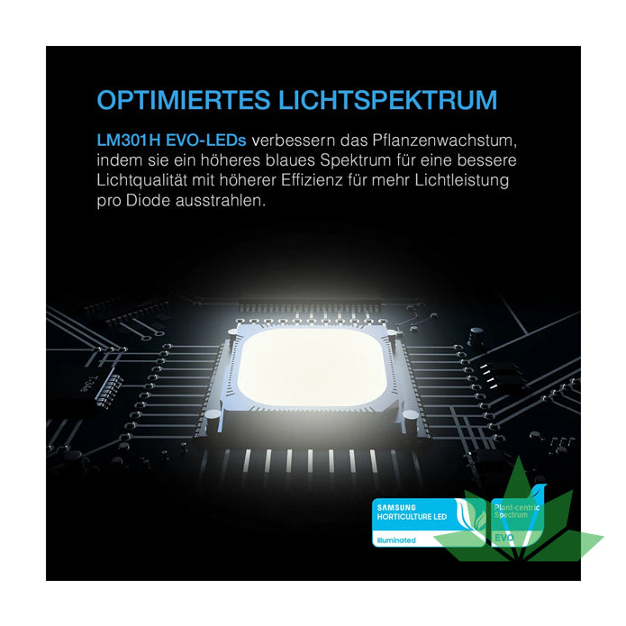 Jede IONFRAME-Leuchte ist mit originalen Samsung LM301H EVO-Dioden ausgestattet, der neuesten Beleuchtungstechnologie für den Gartenbau, die eine intensive Helligkeit bei höherer Effizienz erzeugt. Diese Leistung ist den führenden Samsung LM301H und LM301B LEDs sowie Bridgelux 3030 und anderen LEDs der vorherigen Generation überlegen. EVO-Dioden tragen zu einem besseren Pflanzenwachstum bei, indem sie eine bessere Lichtqualität und eine höhere Lichtleistung pro Diode mit einem höheren blauen Spektrum und einer höheren Effizienz im Vergleich zu Nicht-EVO-Dioden abgeben. Die IONFRAME EVO4 wird von einem Array aus (4) 395 nm UV-Dioden, (28) 660 nm OSRAM Rot-Dioden und (4) 730 nm OSRAM Rot-Dioden unterstützt, um ihre Lichtleistung im gesamten Spektrum zu vervollständigen.