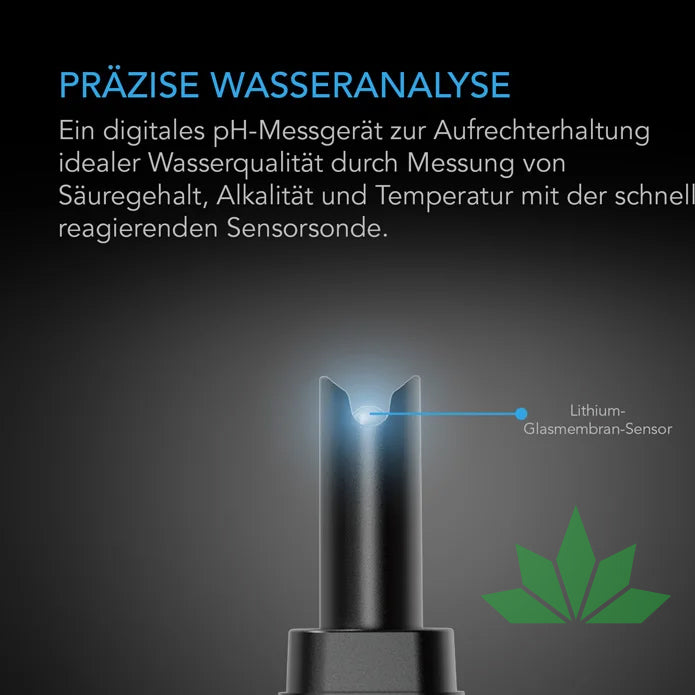 Ein digitales Wasserqualitätsmessgerät zur Messung von Säuregehalt, Alkalität und Temperatur des Wassers, um dessen Qualität für Gartenbau- und Wasserbehandlungsanwendungen zu optimieren. Die hochreaktive Sensorsonde nutzt eine Lithium-Glasmembran zur sofortigen Bestimmung von pH-Messwerten mit hochpräziser ±0,1 Genauigkeit. Dieses pH-Stift-Testgerät für Wasser verfügt über eine IP-67 Zertifizierung, speziell versiegelt um Feuchtigkeit und Hitze zu widerstehen sowie störenden Staub und Sand abzuhalten. Für weiteren Schutz ist das Hydroponik pH-Meter mit einem Sensorschutz ausgestattet, um Ihre Sonde zwischen den Anwendungen zu schützen. Die beiliegenden 4,00 pH und 7,00 pH Kalibrierungslösungen gewährleisten konstant genaue Messungen, wobei erstere auch ordnungsgemäße Lagerbedingungen unterstützt, um die Lebensdauer des pH- und PPM-Meters zu verlängern.