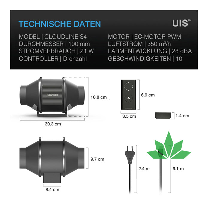 AC - CLOUDLINE PRO S4, leises Inline-Lüftersystem mit Drehzahlregler, 100 mm