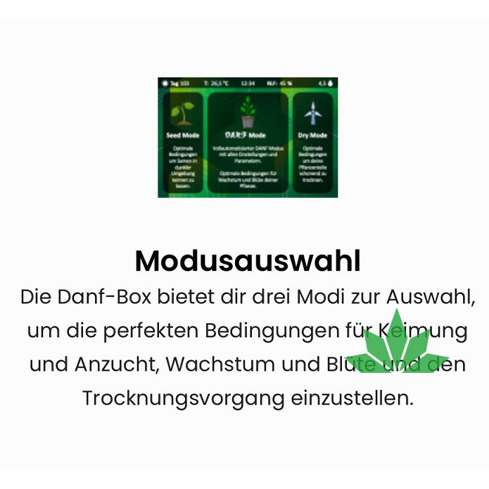 - Du kannst zwischen 3 Modi wählen, dem Keimungsmodus, dem Wachstumsmodus und dem Trocknungsmodus. Deine Pflanze kann seinen kompletten Zyklus in der Box verbringen, du musst keine weiteren Teile deiner Wohnung opfern.