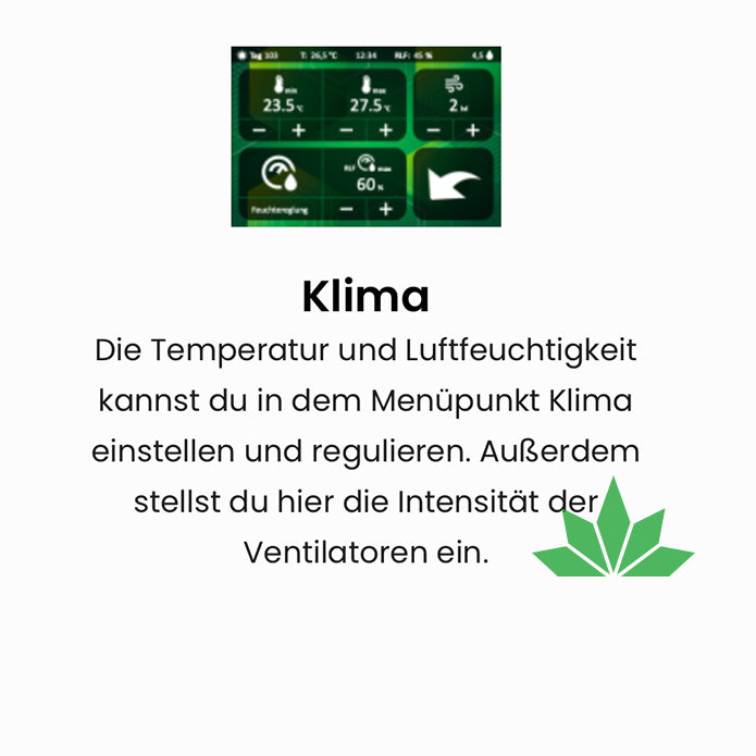 - Temperatur und Luftfeuchte sind regulierbar. Durch eine im Haus entwickelte Mini KI in der Software passt sich das Klima in der Box langsam deinen Zielwerten an, ohne wild gegenzusteuern, und vermeidet so starke Temperaturschwankungen.