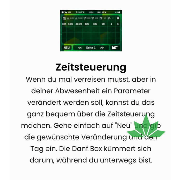 - Mit unserer Zeitsteuerung kannst du Einstellungen in der Box verändern, während du nicht zuhause bist. Alle Parameter sind so veränderbar und ermöglichen es dir auch mal über einen längeren Zeitraum zu verreisen.