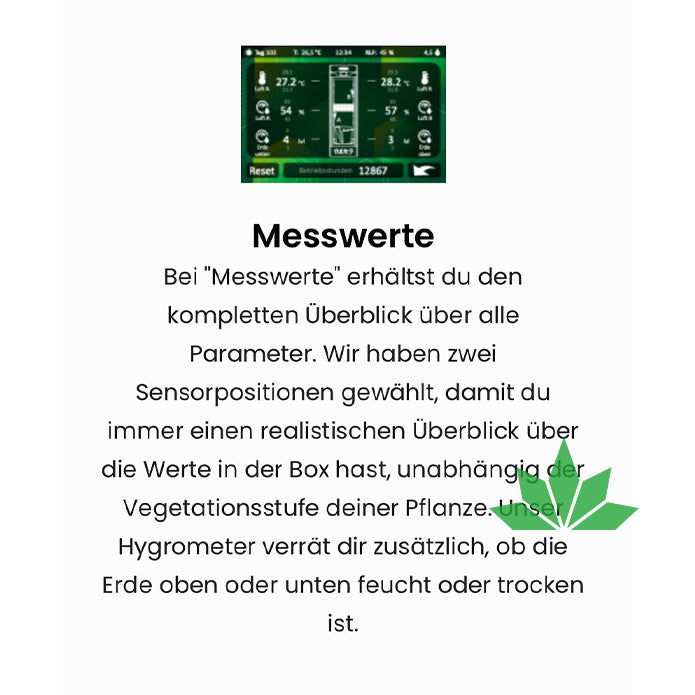 - Zwei Sensorenstandorte, oben und unten, geben dir stets den besten Überblick über alle Parameter, egal in welchem Stadium sich deine Pflanze befindet.